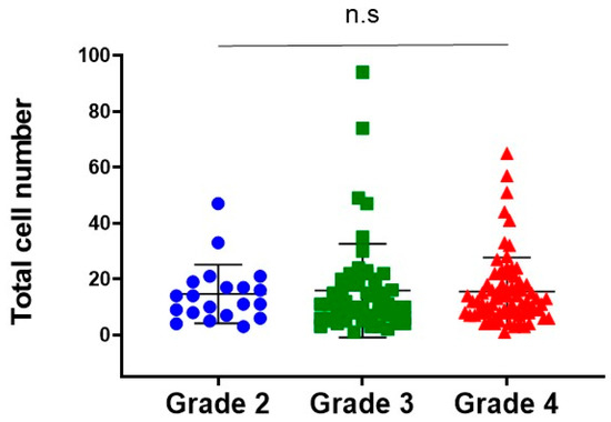 The total number of cells in each view captured by microscopy was counted and compared by Pfirrmann MRI classification. No significant difference in the total number of cells was found among the three grades (grade 2: 14.6 ± 10.5, grade 3: 15.8 ± 16.7, grade 4: 15.5 ± 1.4, Figure 4).