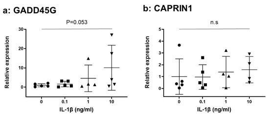 2.4. Gene Expression of GADD45G and CAPRIN1 and Effect of Interleukin-1β Stimulation