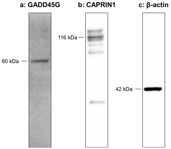 Western blotting of GADD45G (a) and CAPRIN1 (b) expression in cultured human nucleus pulposus (NP) cells. β-actin (c) served as a loading control.