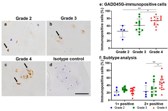 Immunohistochemical staining for GADD45G (a–c) in human nucleus pulposus (NP) tissues. Pfirrmann grade 2 (a), grade 3 (b), grade 4 (c), and isotype control (d). Scale bar: 50 μm (×400 magnification). Percentage of immunopositive cells for GADD45G (e) and the subtype analysis by the intensity of immunostaining (f) in human nucleus pulposus (NP) tissues by Pfirrmann classification. * p < 0.05, ** p < 0.01.