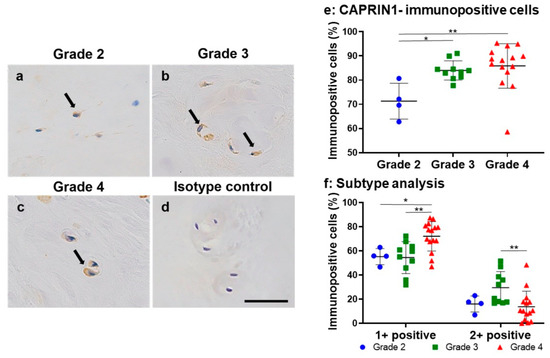 Immunohistochemical staining for CAPRIN1 (a–c) in human nucleus pulposus (NP) tissues. Pfirrmann grade 2 (a), grade 3 (b), and grade 4 (c), and isotype control (d). Scale bar: 50 μm (×400 magnification). Percentage of immunopositive cells for CAPRIN1 (e) and the subtype analysis by the intensity of immunostaining (f) in human nucleus pulposus (NP) tissues by Pfirrmann classification. * p < 0.05, ** p < 0.01.