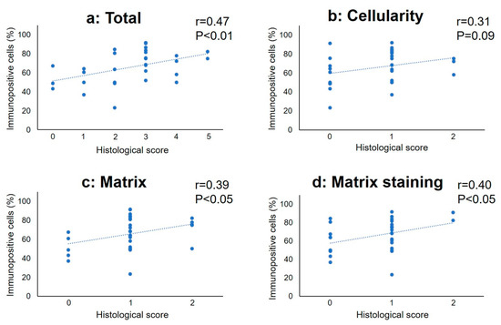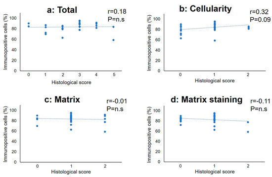 The percentage of GADD45G-immunopositive cells positively correlated with the total histological score (r = 0.47, p < 0.01). The subclass analysis showed that the percentage of GADD45G-immunopositive cells was significantly correlated with the histological scores of “matrix” (r = 0.39, p < 0.05) and “matrix staining” (r = 0.40, p < 0.05); however, no significant correlation with that of “cellularity” was found (Figure 9). In contrast, there were no significant correlations between the percentage of CAPRIN1-immunopositive cells and the histological score (Figure 10a) or its subtype score (Figure 10b–d).