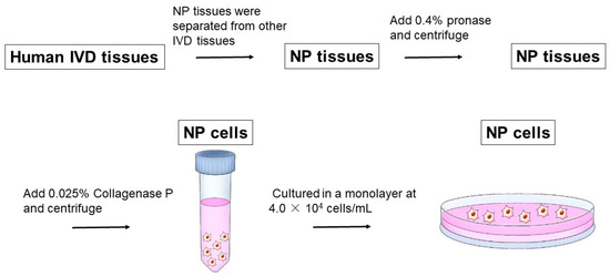 Human IVDs were obtained from surgical specimens (five women, 50–75 years of age (mean 67 years) and with Pfirrmann MRI grades 4 [21]). NP tissues were macroscopically separated from other structures of human IVD tissues, including the AF and cartilaginous end-plates. Human NP cells were cultured in a monolayer after isolation from NP tissues through sequential enzyme digestion, as previously reported [48]. Briefly, following 0.4% pronase and 0.025% collagenase P digestion, the cells were washed with Dulbecco’s modified Eagle’s medium and Ham’s F-12 medium (DMEM/F12; Gibco, Palo Alto, CA, USA), and cultured in a monolayer at 4.0 × 104 cells/mL with 5% CO2 and 95% air in complete medium (DMEM/F12 containing 10% fetal bovine serum, 25 μg/mL ascorbic acid, 10,000 units/mL penicillin, and 10,000 μg/mL streptomycin) (Figure 11). The medium was changed every three days. Primary cultured cells were used in all experiments conducted in this study. The cells in six-well plates were pre-cultured to 80% confluence (approximately 14 d) in all sets of experiments.