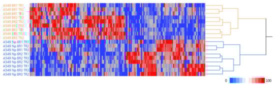 In total, 4306 master proteins were identified with at least one unique peptide and mapped to 4170 unique gene symbols, acquiring three biological replicates in triplicate runs for the two examined conditions. The application of linear discriminant analysis (LDA []) to the 18 protein lists allowed us to extract statistically significant proteins (F ratio ≥ 4.5 and p < 0.05) which could then be processed by hierarchical clustering, highlighting a clear separation in the two main branches and the different behaviour of A549 cells expressing when either an empty vector or SARS-CoV-2 Np, as reported in Figure 1.