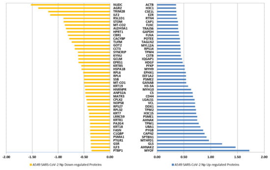 Differentially expressed proteins identified in A549 cells expressing an empty vector and SARS-CoV-2 N protein through label-free quantification with MAProMa software. Orange bars and negative DAve values refer to down-regulated proteins in A549 transfected with SARS-CoV-2 N protein, while light blue bars and positive DAve values refer to up-regulated proteins in A549 cells transfected with SARS-CoV-2 N protein. For each protein, the gene name and related DAve value (ratio of protein expression) are reported.