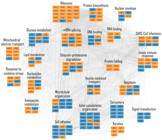 Protein–protein interaction (PPI) network of differentially expressed proteins in A549 cells with empty vectors and A549 cells transfected with SARS-CoV-2 N protein. Physical or/and functional interactions are highlighted by thicker edges and in consideration of experimental (STRING score > 0.15) and database (STRING score > 0.35) annotated interactions. The networks were visualized by Cytoscape v.3.9.1 software, while biological processes were retrieved by STRING enrichment. The color code of distinct nodes reflects the differential expression of a protein in the examined conditions (orange for up-regulated in A549 with empty vector and blue light for up-regulated in A549 with SARS-CoV-2 N protein).