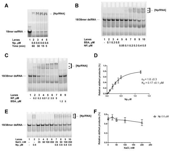 In order to investigate a possible functional interaction between Np and the cellular RNA helicases DDX1 and DDX3X, full-length SARS-CoV-2 Np was expressed in E. coli and purified (Supplementary Figure S1B,C). The recombinant protein was able to bind ssRNA, as revealed by EMSA experiments (Figure 4A), indicating that it was fully functional. The optimal substrate of DDX1 and DDX3X RNA helicases is dsRNA with a short 5′-protruding ss end. SARS-CoV-2 Np has been shown to bind structured partially dsRNA regions such as stem-loops with high affinity []. Thus, the binding of recombinant Np to dsRNA was assessed by EMSA. A fluorescently labelled 18/38 mer partially dsRNA oligonucleotide with a 5′-protruding end was used, which is the preferred substrate for the DDX1 and DDX3X RNA helicases. Np was able to shift the partially dsRNA substrate (Figure 4B, lanes 5–10; Figure 4C, lanes 2–7), generating signals with different electrophoretic mobilities (Figure 4B,C, indicated by asterisks), as is consistent with the formation of protein–RNA complexes of increasing molecular weight. Quantification of the signals allowed us to reveal a cooperative binding mode, consistent with previous results [], and an apparent binding affinity of 0.17 µM (Figure 4D). Next, the interaction of Np with the partially dsRNA substrate was tested in the presence of increasing NaCl concentrations in a physiological range of 25–200 mM (Figure 4E, lanes 7–10). No significant reduction of Np–RNA interactions was observed, even at the highest salt concentration (Figure 4F). Thus, recombinant Np was able to bind cooperatively partially to dsRNA with high affinity in a salt-resistant manner.