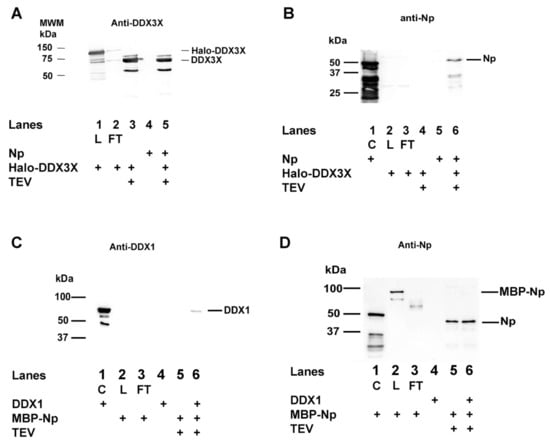 Both DDX1 and DDX3X have been suggested to interact with SARS-CoV-2 Np in cells through co-IP and IF experiments []. However, such approaches did not assess whether the interaction was direct or mediated by additional factors, either by proteins or RNA. Thanks to the availability of all three recombinant proteins, here their direct interaction was tested in pull-down experiments in the absence of other factors. In a first set of experiments, HALO-tagged recombinant full-length human DDX3X, bound to HALO affinity beads, was incubated with recombinant Np. Subsequent elution of the pulled-down material by TEV protease digestion of the HALO tag released both proteins, as revealed by Western blot with specific antibodies (Figure 5A,B, lane 5, 6). Performing a mock reaction with Np alone incubated with the Halo tag captured on the beads as a negative control did not result in its retention (Figure 5B, lane 5). In a second set of experiments, MBP-tagged Np bound to MBP affinity beads was incubated, together with purified recombinant DDX1. Subsequent elution of the pulled-down material by TEV protease digestion of the MBP tag released both proteins, as revealed by Western blot with specific antibodies (Figure 5C,D, lane 5). A mock reaction with DDX1 alone, incubated with the MPB tag captured on the beads as a negative control, did not result in its retention (Figure 5C, lane 4).