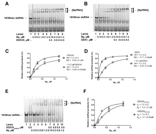 Next, Np was titrated in the presence of a DDX3X catalytically dead mutant, where the two aspartic acids of the Walker B D-E-A-D motif had been mutated to alanines (mutant DDX3XDADA). These mutants are devoid of ATPase and helicase activities []. The DDX3XDADA mutant was still able to stimulate the RNA binding activity of Np (Figure 6E, compare lanes 2–6 with lanes 7–10), increasing 3- fold its apparent affinity, as shown by the decreasing KD value from 0.3 µM to 0.1 µM (Figure 6F). Overall, these data indicated that DDX3X and DDX1 were able to stimulate the binding affinity of Np to dsRNA and that the helicase activity was not necessary for such stimulation.