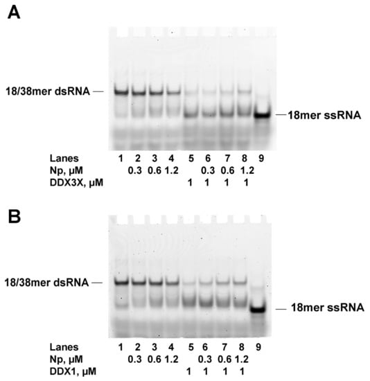 DDX1 and DDX3X are endowed with the ability to unwind dsRNA in an ATP-dependent manner. Thus, the effects of Np on the helicase activities of both enzymes were investigated in a helicase assay in the presence of ATP and the fluorescently labelled 18/38 mer partially dsRNA substrate and the products analyzed by native PAGE. As expected, Np did not show any RNA helicase activity (Figure 7A,B, lanes 2–4). Conversely, displacement of the labelled 18 mer strand was observed with both DDX3X and DDX1 (Figure 7A,B, lane 5). When DDX3X or DDX1 were incubated in the presence of Np, however, inhibition of their helicase activity was observed, as indicated by the decrease in the displaced products and the increase in the unwound substrate (Figure 7A,B, compare lane 5 with lanes 6–8).
