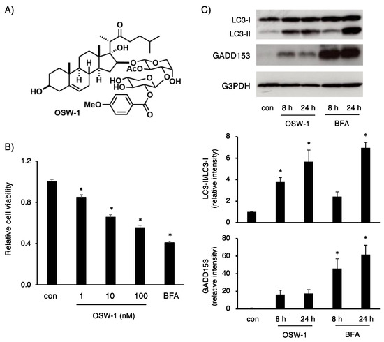 OSW-1 decreased cell viability in Neuro2a cells. (A) Structure of OSW-1. (B) Neuro2a cells were treated with OSW-1 at the indicated concentration and BFA (0.5 μg/mL) for 24 h. Cell viability was measured as described in Materials and Methods. The value obtained from the untreated cells was considered as “1.0”. Each value represented the mean ± SEM from six independent cultures. (C) Neuro2a cells were treated with OSW-1 (10 nM) and BFA (0.5 μg/mL) for the indicated time. Expression of the indicated proteins was detected by Western blotting analysis, and the relative amount of each protein was calculated as described in Materials and Methods. The values obtained from the cells at 0 h (con) were considered as “1.0”. Each value represented the mean ± SEM from four to five independent cultures. Values marked with asterisks are significantly different from the values of untreated cells (* p < 0.05).