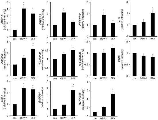 To comprehensively understand the gene fluctuation induced by the OSW-1 treatment, we performed a microarray analysis using cells with or without OSW-1 for 12 h and found that OSW-1 changed many types of genes in Neuro2a cells. Since OSW-1 is known to influence lipid metabolism, especially cholesterol metabolism [4,5,24], we listed some OSW-1-responsive genes associated with cholesterol metabolism and lipid transfer (Figure 2A). We also focused on the genes regulating ER–Golgi homeostasis and autophagy that were influenced by the OSW-1 treatment. Among them, we chose five genes, ABCA1, CREBRF, ZDHHC22, Arfgap3, and Mxd4, which were ranked as the most OSW-1-inducible genes, and their induction was verified by RT-PCR (Figure 2B). We also investigated the gene expression of some ER and Golgi stress-related factors. OSW-1 treatment for 8 h induced five genes that we selected; however, their induction by the BFA treatment differed. Both GADD153 and GADD34, which are ER stress-inducible factors, were dramatically induced by treatment with BFA but not OSW-1. On the other hand, TFE3 and TFEB mRNA are reported as not only Golgi stress sensors but also autophagy-related transcription factors [25,26,27]; however, their mRNA expression was not significantly induced by the OSW-1 treatment. Arf4, which is reported to be a CREB3-regulated gene, was induced by BFA but not OSW-1 [16].