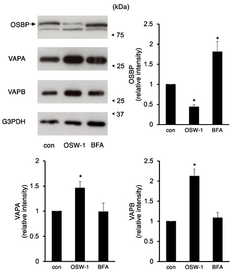 OSBP has been reported as one of the primary targets of OSW-1 [2]. OSBP forms a complex with VAP proteins between the ER and the Golgi apparatus and is involved in cholesterol transport [4,5]. Therefore, we investigated the effects of OSW-1 or BFA treatment on the expression of these factors. The OSW-1 already reduced OSBP expression at 8 h of treatment and, after 16 h of treatment with the OSW-1, the OSBP expression was reduced by less than half compared to the unstimulated control cells (Figure 3). On the other hand, the BFA treatment for 16 h accumulated OSBP, and its molecular size was slightly lower. In contrast, the OSW-1 treatment increased the amount of VAPA and VAPB proteins by 1.5- to 2-fold, but the BFA did not alter their expression.