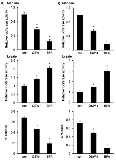 The cells in the 48-well plate transfected with the SP-NL-MH or hANG-myc-NL gene were incubated for 42 h. After that, the culture medium was replaced with OPTI-MEM medium and treated with OSW-1 (10 nM), BFA (0.5 μg/mL), or vehicle for an additional 6 h. The culture medium and cells were lysed with Passive Lysis Buffer (Promega, Madison, MI, USA) and harvested. An equal amount of each sample was mixed with the diluted NanoLuc substrate (Promega), and the luciferase activity was measured by a Glo-MAX luminometer (Promega).