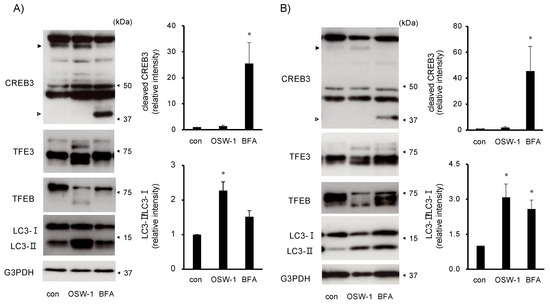 Since it has been reported that OSW-1 triggers Golgi stress responses [6], we examined whether the OSW-1 induced Golgi stress responses in this cell line. As the ER stress responses by the OSW-1 and BFA were different (Figure 1C and Figure 2B), their effects on CREB3 cleavage and the expression of TFE3/TFEB were also quite different. The treatment with BFA for 8 h clearly induced cleavage of full-length CREB3, but the OSW-1 showed little CREB3 cleavage after 16 h of treatment (Figure 5). On the other hand, the OSW-1 treatment for 8 h shifted a portion of the TFE3 and TFEB to the lower molecular weight side, which has been reported to be the dephosphorylation of TFE3/TFEB upon Golgi stress [25]. The effects of the BFA stimulation on the TFE3 and TFEB were slight at 8 h of stimulation but were similar to those of the OSW-1 at 16 h of stimulation. TFE3 and TFEB have also been reported to regulate some autophagy-related genes [26,27]. Thus, the LC3-II, one of the autophagic markers, was similar to the changes in TFE3/TFEB with the OSW-1 and BFA treatments (Figure 1C and Figure 5B).