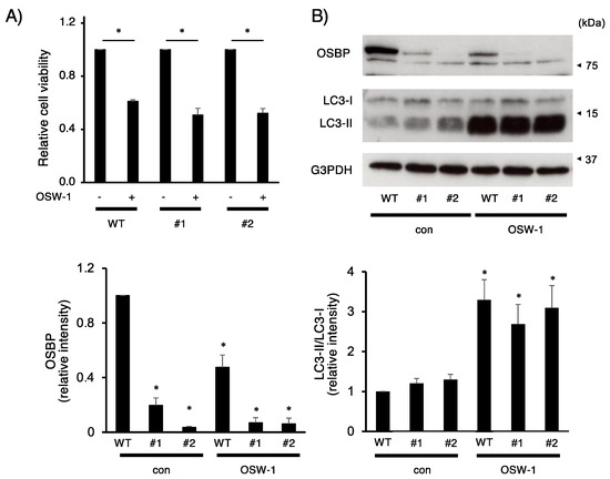 Finally, we established OSBP-deficient Neuro2a cells using the CRISPR/Cas9 system and evaluated their features. Unexpectedly, the OSBP deficiency hardly influenced the expression of VAPA, VAPB, TFE3, and TFEB proteins, although treatment with OSW-1 influenced the expression of these proteins (Supplementary Figure S1). Then, we compared cell viability and OSW-1-stimulated changes in the LC3-II/LC3-I ratio between wild-type and OSBP-deficient cells. The OSW-1 stimulation caused significant cytotoxicity against wild-type and two OSBP-deficient cell lines (#1 and #2), but there was little effect of OSBP deficiency on OSW-1 toxicity (Figure 6A). In addition, the loss of OSBP in Neuro2a hardly changed the LC3-II/LC3-I ratio in the presence or absence of OSW-1 (Figure 6B).