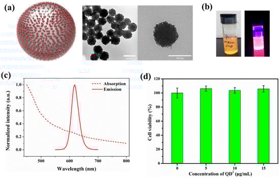 (a) Diagram of QD2 structure (left) and TEM images of QD2 (right). (b) Photograph of QD2 under visible light (left) and 365 nm UV light (right) (c) Excitation and emission spectrum of QD2. (d) Cell viability test of QD2-treated HUVECs.