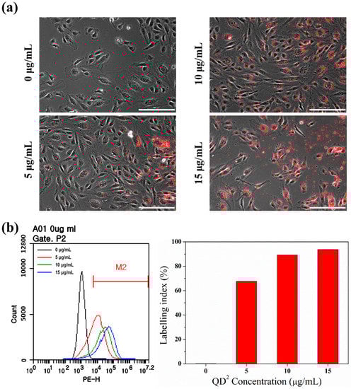 (a) Phase-contrast images (×20), scale bar size is 200 μm. (b) Flow cytometry analysis (left) and labeling index (right) of HUVECs with various concentrations of QD2 (5 μg/mL, 10 μg/mL, 15 μg/mL), 24 h after seeding.