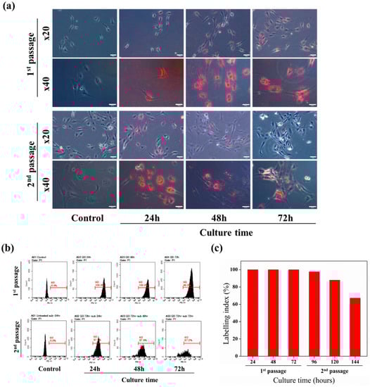 Retention of QD2 in HUVECs was investigated by using phase-contrast imaging and flow cytometry (Figure 3). Because QD2 might be secreted to the extracellular matrix (ECM) at high cell density, causing subsequent reduction of label retention, the initial cell density of HUVECs was adjusted to 5000 cells/cm2 []. As shown in Figure 3a, QD2 was located in the HUVECs of the first passage, whereas fluorescence appeared after 72 h in culture. The fluorescence signal from uptaken QD2 was also retained in the HUVECs of the second passage until 24 h, after which its intensity slightly decreased. Based on flow cytometry results, the LI of HUVECs was calculated to quantitively evaluate the retention of QD2 in HUVECs (Figure 3b,c). For the first passage HUVECs, LI was maintained at almost 100%. LI of HUVECs of the second passage was 97.5% 24 h after passage. However, it decreased to 87.9% and 67.2% at 48 and 72 h after passage, respectively. We hypothesized that the decrease in LI originated from the proliferation of HUVECs, leading to an increase in their numbers, whereas the amount of QD2 remained constant. As a result, LI related to the amount of contained QD2 in each HUVEC was decreased. These results indicated how the expiration time of QD2 labeling might be longer in differentiating or non-cycling cells than in proliferating cells.