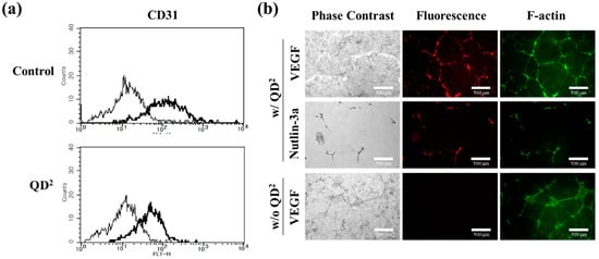 (a) Flow cytometry analysis of CD31 in native and QD2-labeled HUVECs. (b) Tube formation assay of control and QD2-labeled HUVECs. QD2 fluorescence enables following vessel formation in situ, overlapping with phalloidin staining. Treatment of angiogenic factor, VEGF (10 ng/mL), an angiogenesis inhibitor, and nutlin-3a (7.5 μM) reflects enhancement or breakdown of vessel formation (×20, scale bar = 500 μm).