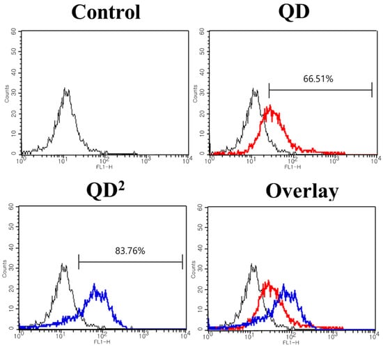 To compare the cell-loading efficiency of QD2 with a single QD, each HUVEC was treated with the same concentrations of QD and QD2 for uptake. Figure 5 represents the ratio of labeling of QD and QD2 after 24 h. The total QDs in QD2 were less than those in a single QD at the same concentration. However, QD2 showed a higher ratio of labeling than single QD (83.8% vs. 66.5%). The higher photoluminescence intensity of QD2 might be the cause of this higher labeling efficiency of QD2 compared with a single QD [,].