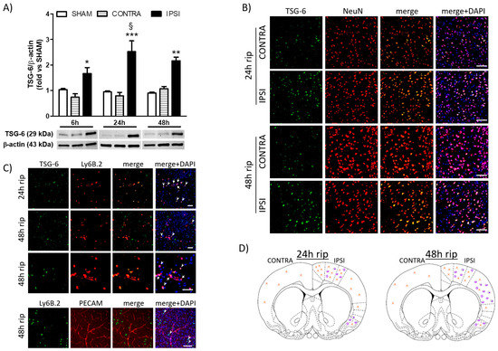 Transient cerebral ischemia caused by 1 h MCAo, followed by 6 to 48 h of reperfusion, resulted in a significant elevation of TSG-6 protein levels in the ipsilateral cortex of mice, reaching a peak 24 h after the beginning of reperfusion (Figure 1A). By immunofluorescence analysis, we observed that TSG6 was barely evident in a few NeuN immunopositive neurons of the contralateral hemisphere, and it was more abundantly expressed in neurons of the ipsilateral peri-infarct tissue (including the motor and frontal cortices) after 24 h or 48 h of reperfusion (Figure 1B). Moreover, expression of TSG6 was observed in Ly6B.2 immunopositive myeloid cells (i.e., granulocytes and monocytes/macrophages) populating the penumbral cortex at 24 h and 48 h of reperfusion and more intensely in the core region (i.e., parietal cortex) at 48 h of reperfusion (Figure 1C). A schematic representation of the cellular and regional expression of TSG-6 in mice brains after ischemia-reperfusion injury is reported in Figure 1D. These TSG-6 immunopositive myeloid cells were likely infiltrating from the blood vessels, as shown in Figure 1C (arrows and arrowheads).