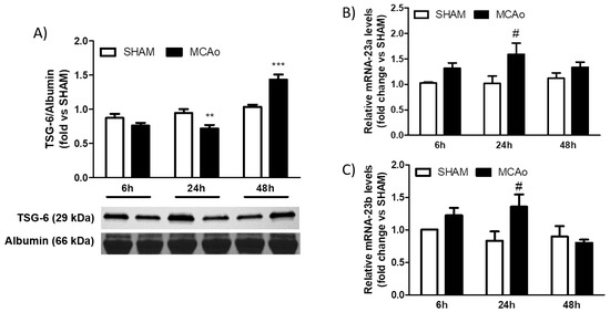 Using the TargetScanMouse database (https://www.targetscan.org/mmu_80/ (accessed on 2 September 2022)), we performed a reverse target prediction analysis to identify miR-23a and miR-23b based on their potential to regulate TSG-6. Interestingly, reduced TSG-6 protein levels observed at 24 h of reperfusion were coincident with higher miR-23a (Figure 2B) and miR-23b (Figure 2C) expression in plasma when compared to sham. Conversely, after 48 h of reperfusion, circulating levels of these miRNAs were not significantly different from sham-operated animals (Figure 2B,C).