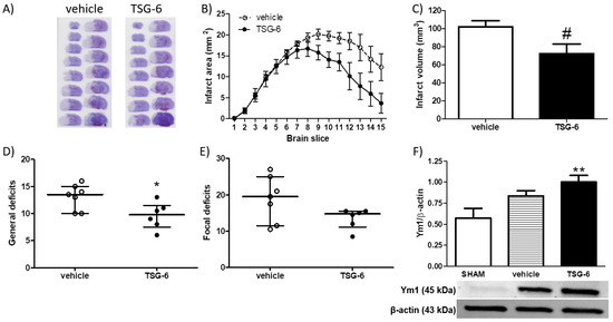 Based on these findings, we hypothesised that late elevation of TSG-6 levels may represent a compensatory mechanism to counteract damage, whereas acute plasma reduction of TSG-6 may be detrimental, thus contributing to the progression of ischemic brain damage. To clarify this issue, we intravenously (i.v.) administered recombinant mouse TSG-6, at a dose of 30 μg/mouse, selected on the basis of previously published observations [35,43,44]. Thus, TSG-6 suspended in a vehicle (phosphate buffered saline, PBS) was administered (30 μg TSG-6/100 μL PBS/mouse) i.v. upon reperfusion (i.e., after 1 h MCAo) and infarct brain damage and neurological deficits were measured 48 h later. Figure 4 (panels A–C) shows that systemic administration of TSG-6 significantly reduced brain infarct damage caused by 1 h MCAo, whereas the cerebral oedema was not affected. Neuroprotection was also associated with attenuation of general neurological deficits caused by the ischemic insult (Figure 4, panels D and E). Interestingly, neuroprotection by i.v. administration of TSG-6 was associated with a significant elevation of cerebral levels of the M2 marker Ym1 (Figure 4, panel F), strongly supporting the hypothesis that this multifunctional protein exerts an important immunomodulatory function that may underlie its neuroprotective effects against ischemic injury.