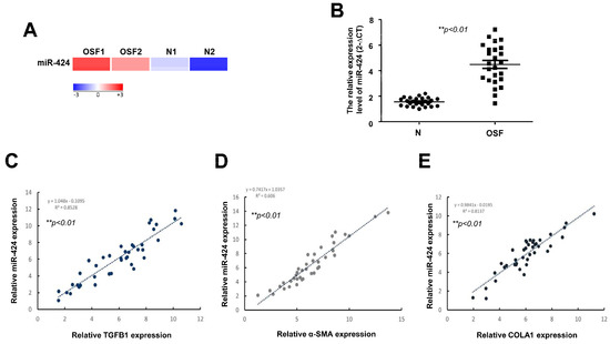 MiR-424 is upregulated in OSF tissues and positively correlated with various fibrosis-associated markers. (A) Heatmap showing differentially expressed miR-424 between normal control (N) and OSF samples. (B) qRT-PCR quantification of expression level of miR-424 in normal control and OSF tissues (n = 25). A positive correlation was observed between miR-424 and numerous fibrosis markers, including transforming growth factor beta 1(TGFB1) (C), alpha smooth muscle actin (ACTA2) (D), and alpha-1 type I collagen (COL1A1) (E).