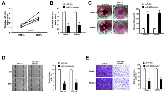 The downregulation of miR-424 in fibrotic buccal mucosal fibroblasts (fBMFs) diminishes several myofibroblast phenotypes. (A) The expression level of miR-424 was elevated in fBMFs compared to BMFs. (B) The expression of miR-424 was markedly reduced using miR-424 inhibitor. A number of myofibroblast characteristics, including (C) collagen gel contraction, (D) wound healing, and (E) transwell migration capacities, were all suppressed in fBMFs receiving miR-424 inhibitor. * p < 0.05 compared to miR-Scr. group.