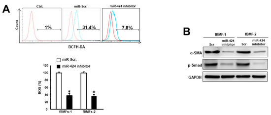 Given that oxidative stress confers to myofibroblast transdifferentiation [13,14] and is under the regulation of miR-424 [18], we assessed the production of reactive oxygen species (ROS) in fBMFs with miR-424 inhibitor. As expected, ROS generation was decreased when miR-424 was downregulated (Figure 3A). Additionally, we showed that the expression levels of the myofibroblast marker, α-SMA, and the phosphorylation of Smad were both inhibited after the suppression of miR-424 (Figure 3B). Collectively, these findings demonstrated that miR-424 can modulate oxidative stress and mediate myofibroblast activation.