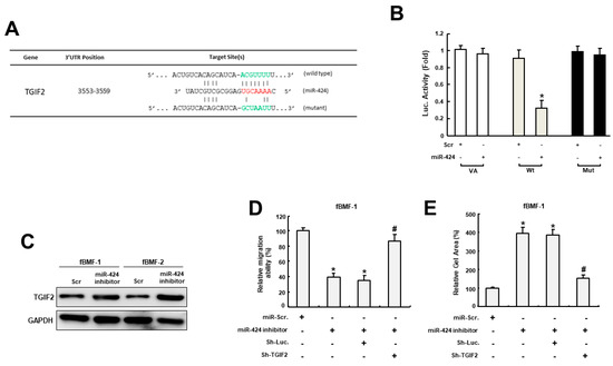 MiR-424 mediates myofibroblast activities via direct binding to TGIF2. (A) An illustration of the three prime untranslated regions (3′-UTR) of full-length (wild type) and mutated TGIF2 complementarity between the seed sequence of miR-424 predicted by the TargetScan in silico browser. (B) The luciferase activity of the reporter construct containing the wild-type TGIF2 3′-UTR was repressed by miR-424, whereas there was no effect on the activity of reporter constructs containing mutant TGIF2 3′-UTR in BMFs. (C) The expression of TGIF2 was upregulated in fBMFs with miR-424 inhibitors. The effects of the miR-424 inhibitor on migration capacity (D) and collagen gel contractility (E) were reversed in fBMFs when the expression of TGIF2 was reduced. * p < 0.05 compared to miR-Scr. group; # p < 0.05 compared to miR-424 inhibitor+Sh-Luc. group.