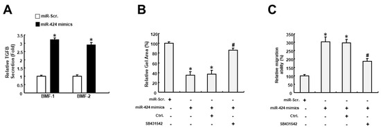 The miR-424-induced myofibroblast features may result from the activation of the TGF-β pathway. (A) The secretion of TGF-β was increased in BMFs treated with miR-424 mimics. (B) Collagen gel contractility was increased in miR-424 mimics-receiving cells, while inhibition of the TGF-β pathway using SB431542 prevented it. (C) The increased migration ability elicited by miR-424 mimics was reduced by SB431542. * p < 0.05 compared to miR-Scr. group; # p < 0.05 compared to miR-424 mimics+ Ctrl. group.