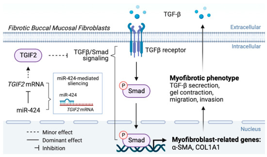 Altogether, current evidence and our findings suggested that there is a feed-forward loop between TGF-β signaling and miR-424 which promotes and maintains myofibroblast activation and collagen deposition. Our data demonstrated that miR-424 can induce another contributor of myofibroblast transdifferentiation, ROS accumulation, which amplifies pathological fibrosis in the oral cavity. Accordingly, targeting the miR-424/TGIF2 axis may be an effective approach to ameliorate fibrosis progression in OSF patients (Figure 6).