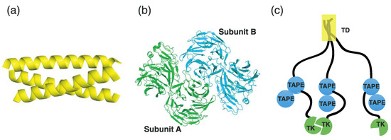 Here, we briefly describe the TD domain structure of EML4 and the TAPE domain structure of EML1, which is structurally homologous to EML4. Three TD domains form a bundle of α-helices, creating a coiled-coil architecture (Figure 2a). The TAPE domain comprises a pair of continuous β-propellers (Figure 2b). The respective WD repeat regions form an antiparallel β-sheet comprising four β-strands. Seven repeated β-sheet units form the β-propeller architecture. Given that EML4-ALK forms a trimer, owing to the association of three respective TD domains, the TK domains from ALK are prone to dimerization, leading to autophosphorylation for activation (Figure 2c).