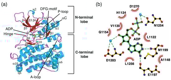 One of the most remarkable hallmarks of ATP binding to the active site is that the adenine ring moiety mainly forms a couple of hydrogen bonds with residues in the hinge region (Figure 3b). Specifically, the N10-bound hydrogen and the N1 nitrogen atoms in the adenine ring form hydrogen bonds with the backbone atoms of Glu1197 and Met1199 in the hinge region. Oxygen atoms in the 5-carbon sugar (O3′) and β-phosphate indirectly interact with Asp1203 and Asn1254, respectively, mediated by adjacent water molecules. In addition, several hydrophobic residues, such as Leu1122, Gly1125, Val1130, Ala1148, and Leu1256, are associated with ADP binding through hydrophobic interactions. Consequently, a local hydrogen bond network, including the hinge region and adjacent water molecules, is assumed to constitute the main mode of ATP binding.
