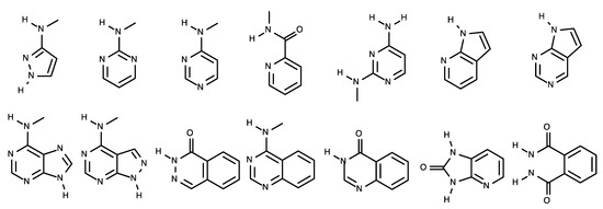 All kinases have an ATP-binding pocket, which an ATP molecule as one of two substrates binds to. This indicates that this ATP-binding mode can be exploited for the development of kinase inhibitors. Indeed, all kinase inhibitors launched in the drug market thus far have been developed based on this binding mode. Specifically, the ATP-binding pocket has a hinge region, where several oxygen and hydrogen atoms forming peptide bonds interact with the adenine moiety of ATP. Accordingly, this adenine component is referred to a hinge binder. In general, a hinge binder consists of hydrogen donors and acceptors and constitutes an essential part of kinase inhibitors. A number of biochemical experiments have shown that this hinge binder in inhibitors plays a crucial role in inhibiting the function of kinases [61]. Typical hinge binder scaffolds for kinase inhibitors are presented in Figure 4.