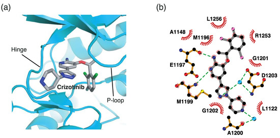 Crizotinib-binding mode. (a) Crystal structure of the TK domain (cyan) in complex with crizotinib. Carbon, nitrogen, oxygen, chlorine, and fluorine atoms are colored gray, blue, red, green, and cyan, respectively. (b) Schematic diagram of crizotinib showing interactions with adjacent residues. The circle and line codes are the same as in Figure 3b.