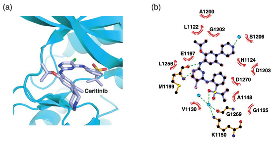 Ceritinib-binding mode. (a) Crystal structure of the TK domain (cyan) in complex with ceritinib. Carbon, nitrogen, oxygen, chlorine, and sulfur atoms are colored marine, blue, red, green, and orange, respectively. (b) Schematic diagram of ceritinib showing interactions with adjacent residues.