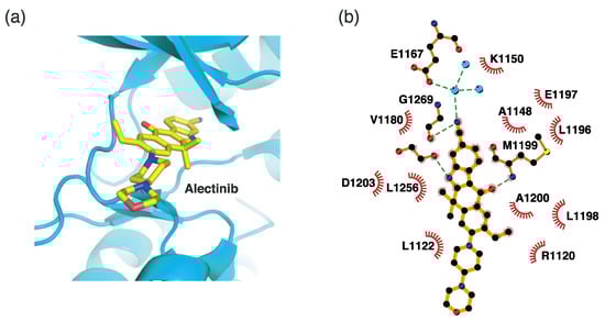 Alectinib-binding mode. (a) Crystal structure of the TK domain (cyan) in complex with alectinib. Carbon, nitrogen, and oxygen atoms are colored yellow, blue, and red, respectively. (b) Schematic diagram of alectinib showing interactions with adjacent residues.