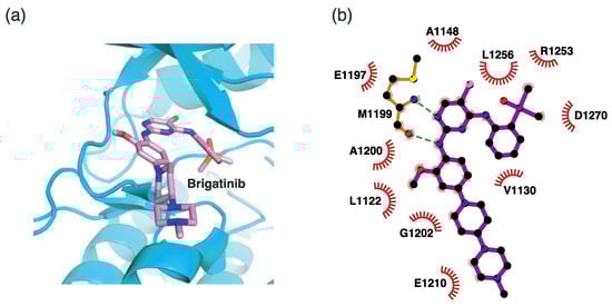 Brigatinib is a second-generation ALK inhibitor. Similarly to ceritinib, the 2-aminopyrimidine moiety of brigatinib functions as a hinge binder (Figure 8). The nitrogen and hydrogen atoms in 2-aminopyrimidine interact with the Met1199 backbone through hydrogen bonds. Brigatinib also interacts with adjacent hydrophobic residues, such as Leu1122, Val1130, Ala1148, Glu1197, Ala1200, Gly1202, Glu1210, Arg1253, Leu1256, and Asp1270.