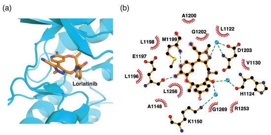 Lorlatinib-binding mode. (a) Crystal structure of the TK domain (cyan) in complex with lorlatinib. Carbon, nitrogen, oxygen, and fluorine atoms are colored orange, blue, red, and cyan, respectively. (b) Schematic diagram of lorlatinib showing interactions with adjacent residues.