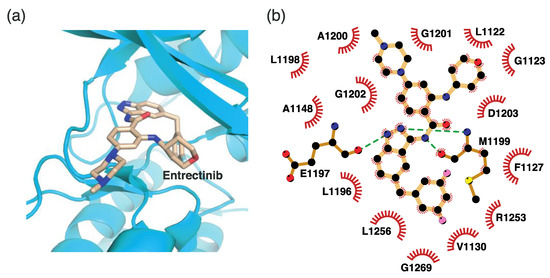 Entrectinib-binding mode. (a) Crystal structure of the TK domain (cyan) in complex with entrectinib. Carbon, nitrogen, oxygen, and fluorine atoms are colored wheat, blue, red, and cyan, respectively. (b) Schematic diagram of entrectinib showing interactions with adjacent residues.