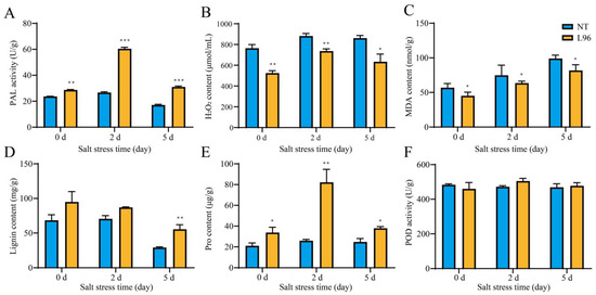 Physiological indices of NT and L96 plant under salt stress. Changes in the contents of (A) PAL, (B) H2O2, (C) MDA, (D) lignin, (E) Pro, and (F) POD in NT and L96 under salt stress (150 mM NaCl). Data represent the mean ± SD from three biological replicates. Significance was determined by the least significant difference, and asterisks indicate statistically significant differences from NT (* p < 0.05, ** p < 0.01, *** p < 0.001).