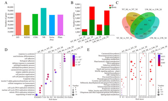 Transcriptome annotation and functional enrichment of DEGs. (A) Functional annotation of genes in GO, KEGG, COG, NR, Swiss-Prot, and Pfam databases. (B) Differential expression analysis of samples under salt stress. (C) Venn analysis of DEGs. (D) GO enrichment analysis of DEGs. (E) KEGG enrichment analysis of DEGs.