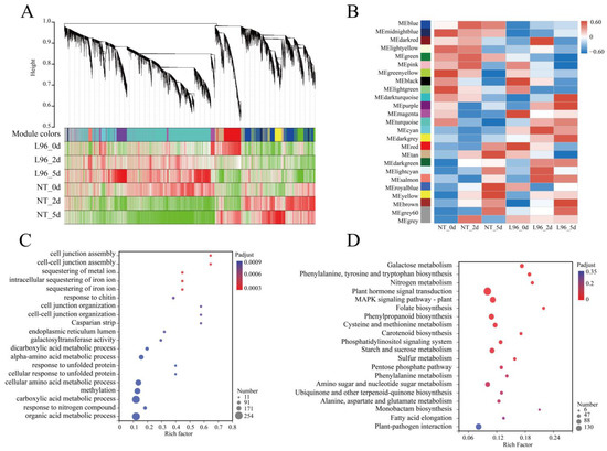 WGCNA analysis of specifically expressed genes in L96. (A) Co-expression network modules are enriched. Each module is given a different color. (B) Module–sample relationships. Each row corresponds to a color module and each column corresponds to a sample. (C) GO enrichment of L96-specific expressed genes. (D) KEGG enrichment of L96-specific expressed genes.