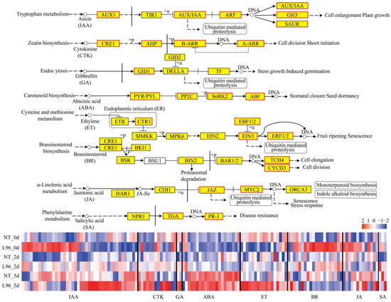 Plant hormone signal pathway activated by L96 and NT under salt stress. Heatmap shows FPKM values in each treatment, normalized using z-score.