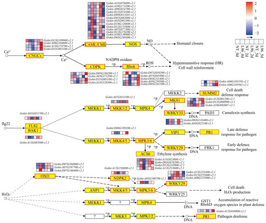 L96 cotton was specifically enriched for 50 genes in the plant-pathogen interaction pathway and the MAPK signaling pathway (Figure 5). In the Ca2+ signaling pathway, four CNGC genes, four CDPK genes, and five Rboh genes were expressed in L96 cotton at higher levels than in NT cotton after 5 days of salt stress. Four CALM genes and nine CLM genes had higher expression in L96 cotton than in NT cotton in normal growth and after 2 days of salt stress but lower expression in L96 cotton than in NT cotton after 5 days of salt stress. In the MAPK signaling pathway, genes mediated by MEKK1-MKK1/2-MPK4-WRKY25/33 and MEKK1-MKK4/5-MPK3/6-WRKY22/29 were specifically expressed in L96 cotton. Two WRKY33 genes, three WRKY29 genes, one NDPK2 gene, and three OXI1 genes were more highly expressed in L96 cotton than in NT cotton in normal growth and after 2 days of salt stress.