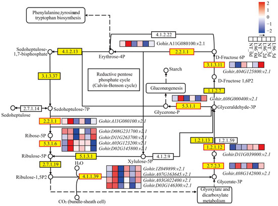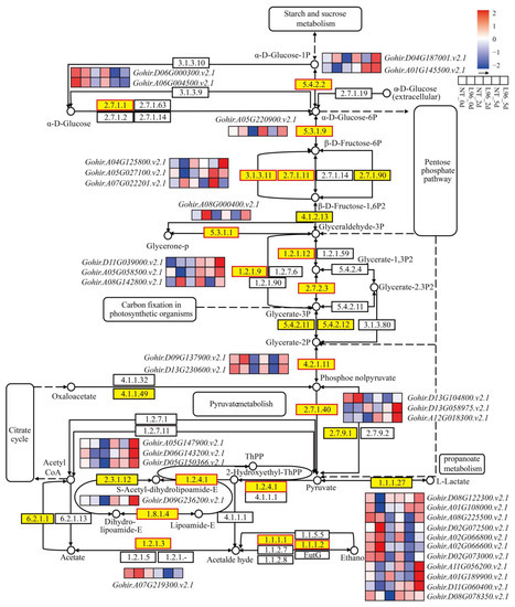 In carbohydrate metabolism, 33 genes, including genes involved in glycolysis and the citrate cycle (TCA cycle), were differentially expressed. The expression of genes such as HK, pgm, GPI, PFK, TPI, PGK, PK, ALDH, and ADH1 was higher in L96 cotton than in NT cotton during normal growth. The expression of the genes HK, gapN, ENO, ALDH, and ADH1 was higher in L96 cotton than in NT cotton, where the genes PDHB, pyk, and pdhD were expressed after 2 days of salt stress. After 5 days of salt stress, a large number of genes were upregulated, and the expression of FBP, pgm, gapN, pyk, PDHB, PDHD, ALDH, and ADH1 was upregulated and was higher in L96 cotton than in NT cotton (Figure 7). These results indicate that transgenic lines have smoother alienation than NT cotton.