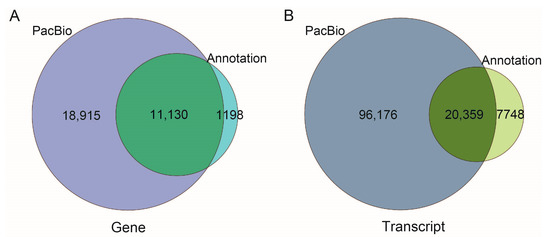 Comparison of transcripts (A) and genes (B) generated by the PacBio sequencing and A. mellifera genome annotation.
